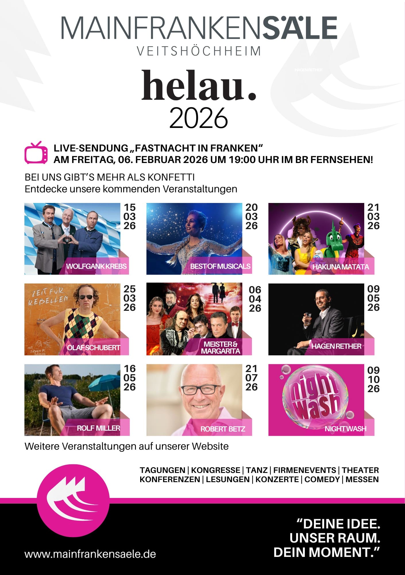 Ob Tagungen, Kongresse, Seminare oder Kulturevents wie Konzerte, Kabarett und Lesungen – die Mainfrankensäle sind die Location für Ihre Veranstaltung im Raum Würzburg. Neben modernster Licht-, Ton- und Medientechnik und einem flexiblen Raumkonzept mit Platz für bis zu 920 Personen profitieren Sie bei uns auch von einem Team aus erfahrenen Veranstaltungstechniker:innen und Eventmanager:innen.