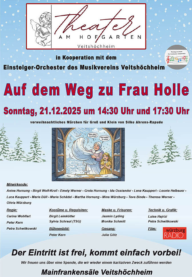 Wenn das Theater am Hofgarten eines kann, dann ist es, klassische Geschichten zeitgemäß und mit viel Liebe zum Detail auf die Bühne zu bringen. Gemeinsam mit dem Einsteiger-Orchester des Musikvereins Veitshöchheim präsentieren sie in diesem Jahr das vorweihnachtliche Bühnenstück „Auf dem Weg zu Frau Holle“ – ein Märchen, das jeder kennt und das doch immer wieder neu begeistert.