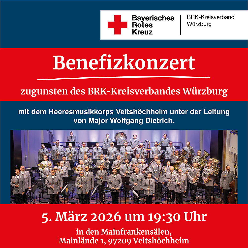 Das Heeresmusikkorps Veitshöchheim veranstaltet am Donnerstag, den 5. März 2026 in den Mainfrankensälen Veitshöchheim ein Benefizkonzert zugunsten des BRK-Kreisverbandes Würzburg.
